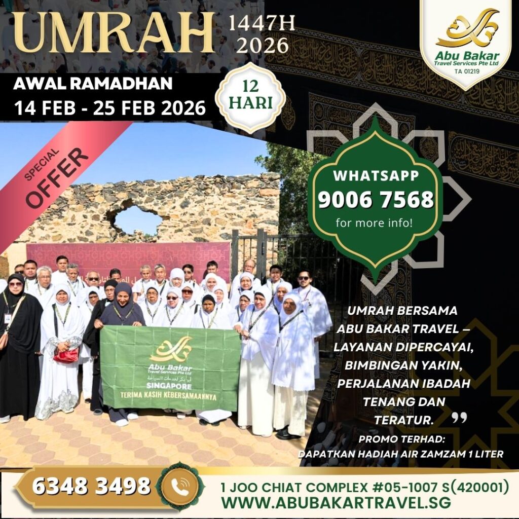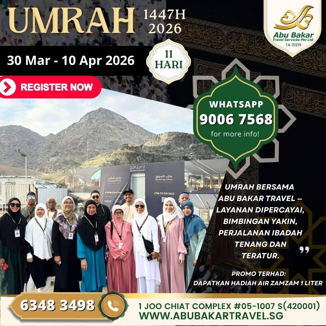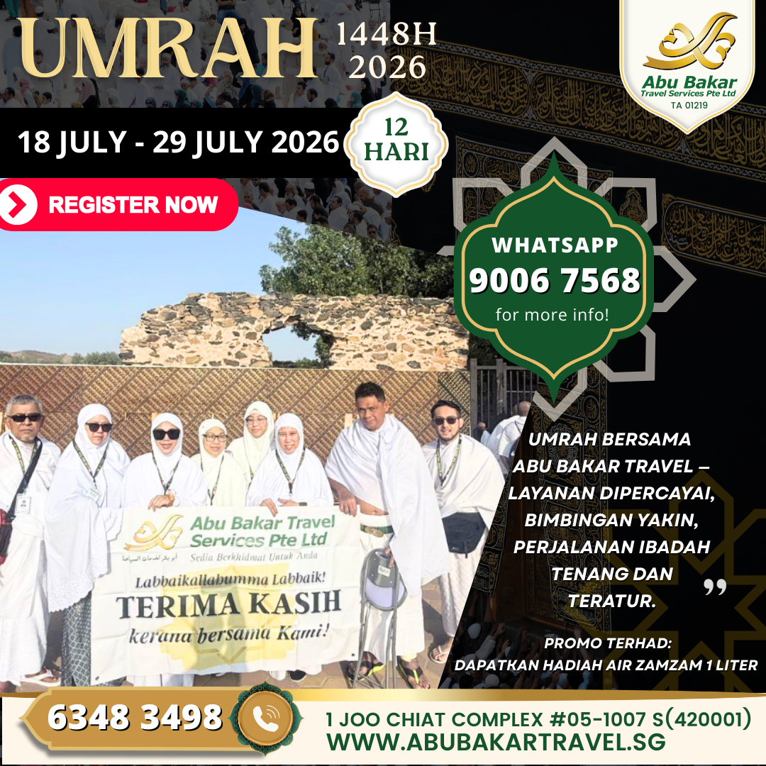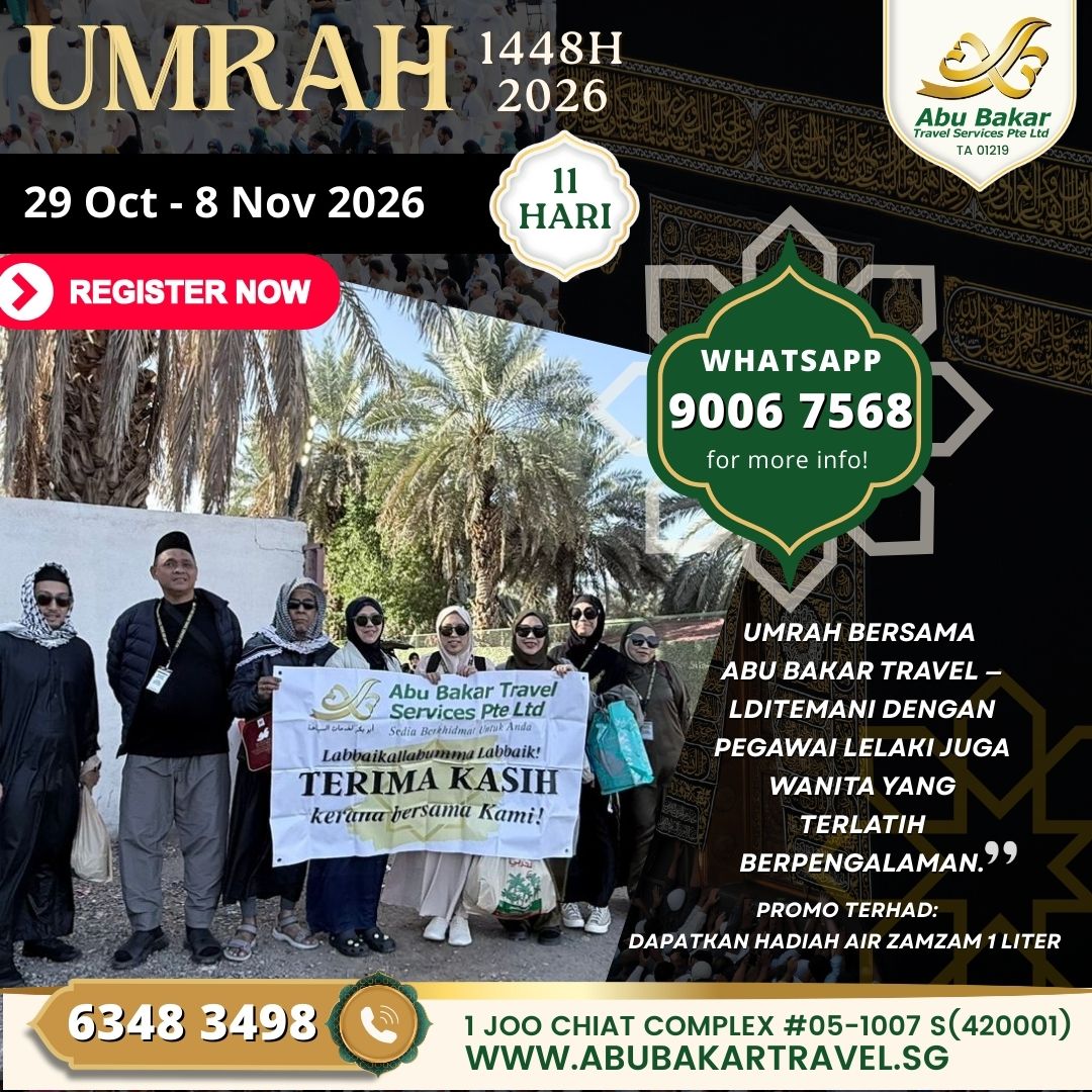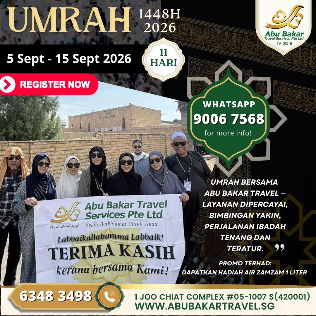 Posted on Jay JkTrustindex verifies that the original source of the review is Google. Alhamdulillah ,selama percutian kami ke Batam 3hari 2malam, kami dapati Oakwood Hotel nya selesa dan makanannya memuaskan.Posted on A’qil AidilTrustindex verifies that the original source of the review is Google. Ustaz was very knowledgeable and the family had a good stay. Recommend it to first timers :)Posted on muhd zulkarnaenTrustindex verifies that the original source of the review is Google. I signed up the umrah package for three person with Abu Bakar Travels. The package includes the class lessons in preparations to equip jemaah the brief knowledge before and during umrah. For all the knowledge and guidance given by Ustaz Salhan, it was sufficient and was made to understand. Doubts were cleared during questions and answers sessions in class. Before departing, Abu Bakar Travel Services (ABTS) ensured that we have packed our basic necessities for the trip, reminded all jemaah what to do before meeting in the airport. The trip from day one till the end was sailing smooth and there again with Ustaz knowledge that brought us to so many places to visit. Jemaah's hospitality was taken care to the extreme by ABTS from the arrival in Medina until the arrival back to SG. I applaude for such an amazing service and guidance provided throughout by ABTS which lead to a smooth journey, knowledge gained and indeed a memorable umrah journey as a first timer. No age or gender was being left behind or was a hassle for ABTS to handle. ABTS professionalism and efficiency left Jemaah with no regrets but indeed a recommended travel service which i would introduce proudly to friends to seek upon should one need to perform for umrah/hajj. Thank you ABTS for your great services! In Allah's wills, may we be given the chance to meet to travel again soon. In Shaa Allah. May ABTS continues to grow in their business with their friendly staffs. Aamiin Ya Rabb.Posted on Yaya NurHidayahTrustindex verifies that the original source of the review is Google. I have my best ever experience in my life with ABU BAKAR TRAVEL .. a lot of thing I learn from Them .. I hopefully I will come HOLY PLACE again and again🤲🏻🤲🏻Posted on Kamariah YahyaTrustindex verifies that the original source of the review is Google. Alhamdulillah for this recent Umrah journey that is filled with sense of blessings and surrounded by feelings of love for Allah SWT and His Messenger PBUH. Thank you ABTS for this experience of self-awareness bringing me back to the many yesteryears though the historical sirah stories, bringing to places for ziarah that I didn't expect that we would go to and filling me with Islamic knowledge. Not forgetting the guided performance of Umrah that is made eased for me and mum. 🙂 شكراً جزيلاً 🙂Posted on Rohayah A LTrustindex verifies that the original source of the review is Google. Alhamdulillah semua nya berjalan dengan lancar. Atas bimbingan ustaz Sahlan kita lebih faham segala amalan yang kita lakukan. Saya dan anak2 sangat2 bersyukur atas kebajikan dan kebaikan yang diberikan kepada kami dan para jemaah lain. In syaa Allah kalau ada rezeki kita akan pergi lagi bersama Abu Bakar Travel Services Pte Ltd. Ribuan terima kasih.Posted on huzaifah nasilTrustindex verifies that the original source of the review is Google. First Umrah completed under Abu Bakar Travel Services. I had a wonderful experience under the guide of Ustaz Sahlan, Ustaz Adel and Cik Siti. It was such a pleasant and exciting journey as Ustaz Sahlan ensure that as we do our ibadah, we also get to learn in detail and visit the sites that have an impact in Islamic history. The itineraries is nicely arranged and hotel accomodations is also very conveniently located within walking distance of Masjid An-Nabawi and also Masjid Al-Haram, as well as near the different amenities. Overall, it was a remarkably superb experience and I would not hesitate to engage this agency again for my future Umrahs InsyaAllah.Posted on Nur SakinahTrustindex verifies that the original source of the review is Google. This was my first umrah and I'm very glad that I went with Abu Bakar travel services. I was guided the whole way and gain a lot of knowledge on the history of Islam and all. Would love to go with them again.